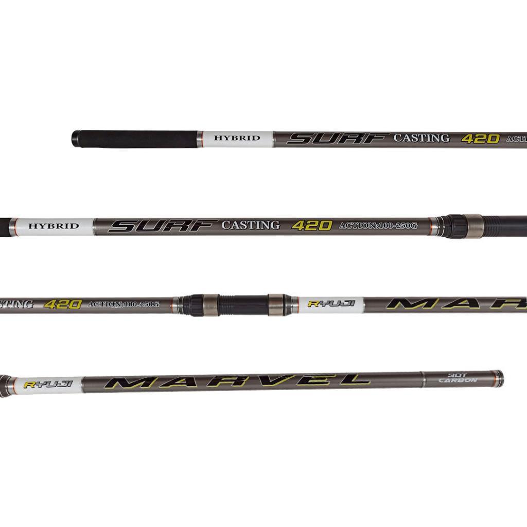 Ryuji Marvel 420cm Surf kamışlar 420cm uzunluğa, Hybrid uç yapısına, 100-250g atış aralığına, 145,5cm taşıma boyuna sahip 3 parçalı surf kamışı.